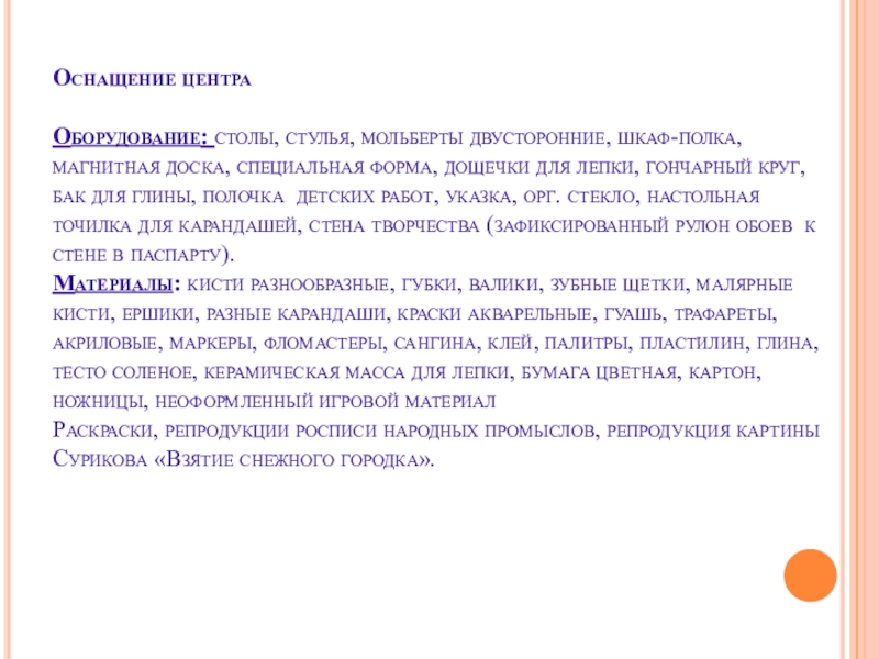 Оборудование: столы, стулья, мольберты двусторонние, шкаф-полка, магнитная доска, специальная форма,