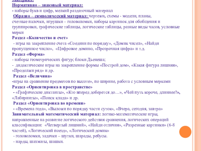счетные палочки, игрушки – головоломки, наборы картинок для обобщения и группировки, графические таблицы, логические таблицы, разные виды часов, условные мерки