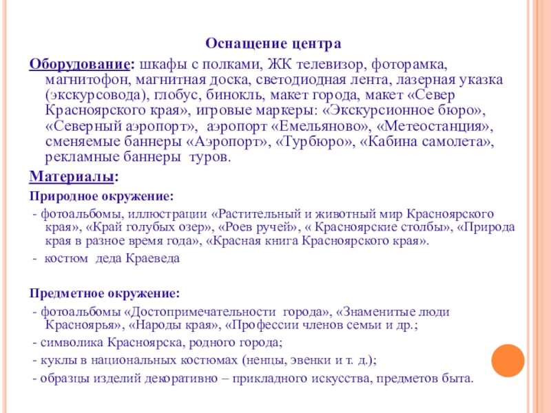 Материал: костюмы народов Севера Красноярского края, куклы в национальных костюмах, костюм деда Краеведа, посуда, неоформленный игровой материал, коврики-скрутки отображающие национальный колорит, наборы диких животных, бамбуковые палочки, деревянные бревнышки, наборы овощей и фруктов.