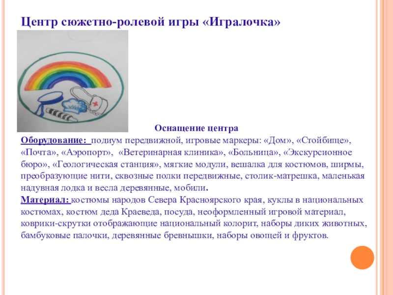Оборудование: подиум передвижной, игровые маркеры: «Дом», «Стойбище», «Почта», «Аэропорт», «Ветеринарная клиника», «Больница», «Экскурсионное бюро», «Геологическая станция», мягкие модули, вешалка для костюмов, ширмы, преобразующие нити, сквозные полки передвижные, столик-матрешка, маленькая надувная лодка и весла деревянные, мобили.