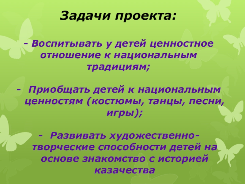 - Воспитывать у детей ценностное отношение к национальным традициям;