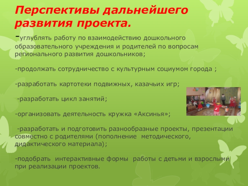 -разработать и подготовить разнообразные проекты, презентации совместно с родителями (пополнение методического, дидактического материала);