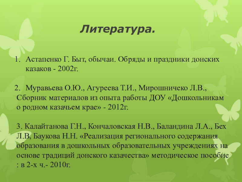 3. Калайтанова Г.Н., Кончаловская Н.В., Баландина Л.А., Бех Л.В, Баукова Н.Н. «Реализация регионального содержания образования в дошкольных образовательных учреждениях на основе традиций донского казачества» методическое пособие : в 2-х ч.- 2010г.