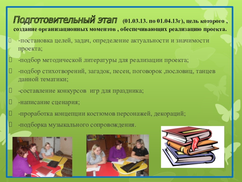 Подготовительный этап (01.03.13. по 01.04.13г), цель которого ,создание организационных моментов