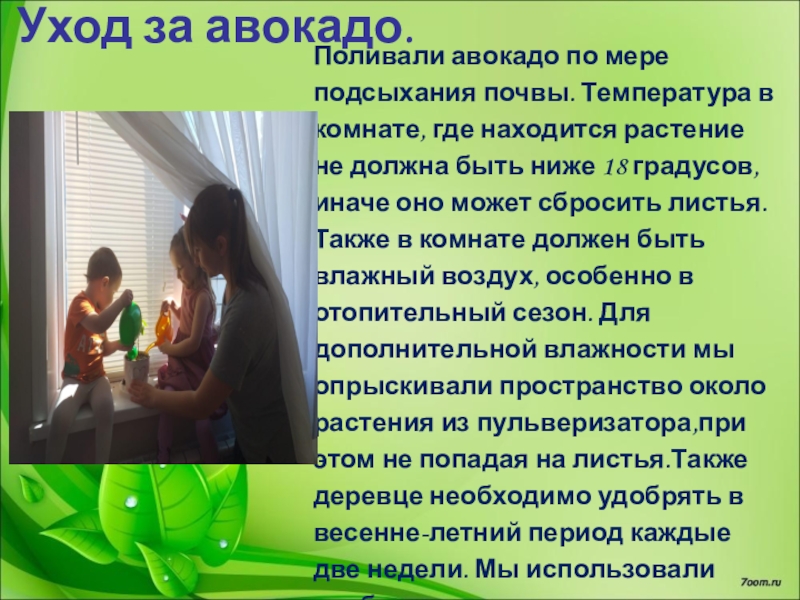 условиям, несмотря на отличия в домашних и климатических условиях, в которых оно произрастает в природе. В результате проделанной нами работы мы познакомились с характеристикой растения, историей и агротехникой выращивания его на родине. Узнали о способах размножения авокадо в комнатных условиях. Работа была достаточно кропотливая, но мы получили хороший результат, который теперь украшает подоконник нашего дома. Мы с удовольствием всей семьёй наблюдаем и ухаживаем за нашим тропическим растением, а оно дарит нам хорошее настроение !