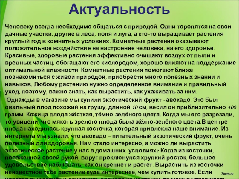 Однажды в магазине мы купили экзотический фрукт - авокадо. Это был овальный плод похожий на грушу, длиной 10 см, весил он приблизительно 400 грамм. Кожица плода жёсткая, тёмно-зелёного цвета. Когда мы его разрезали, то увидели, что мякоть зрелого плода была жёлто-зелёного цвета.В центре плода находилась крупная косточка, которая привлекла наше внимание. Из интернета мы узнали, что авокадо – питательный экзотический фрукт, очень полезный для здоровья. Нам стало интересно, а можно ли вырастить экзотическое растение у нас в домашних условиях? Когда из косточки, посаженной своей рукой, вдруг проклюнулся хрупкий росток, большое удовольствие наблюдать, как он крепнет и растет. Вырастить из косточки неизвестное тебе растение куда интереснее, чем купить готовое. Если удастся вырастить и сохранить авокадо из косточки, то можно утверждать, что растение приспособлено к домашним условиям, несмотря на отличия в домашних и климатических условиях, в которых оно растает в природе.