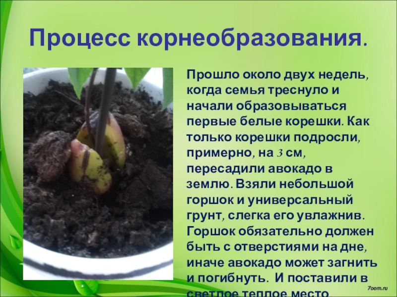 первые белые корешки. Как только корешки подросли, примерно, на 3 см, пересадили авокадо в землю. Взяли небольшой горшок и универсальный грунт, слегка его увлажнив. Горшок обязательно должен быть с отверстиями на дне, иначе авокадо может загнить и погибнуть. И поставили в светлое теплое место, избегая прямых солнечных лучей, во избежании ожогов.