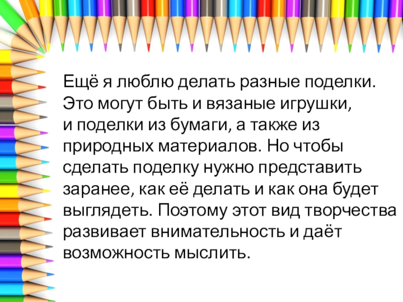 Слайд 6Ещё я люблю делать разные поделки. Это могут быть и вязаные
