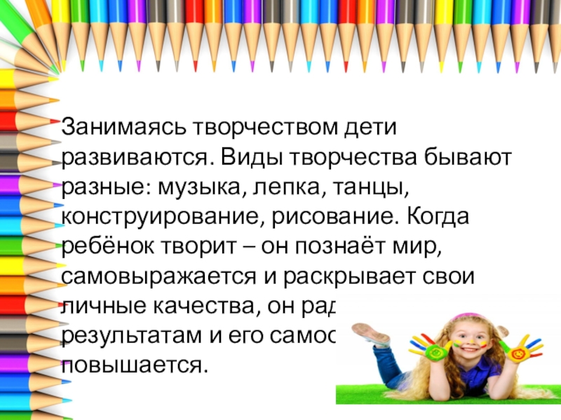 Слайд 3Занимаясь творчеством дети развиваются. Виды творчества бывают разные: музыка, лепка, танцы,