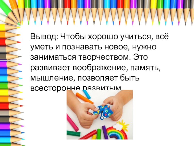 Вывод: Чтобы хорошо учиться, всё	 уметь и познавать новое, нужно заниматься творчеством. Это развивает воображение, память, мышление,