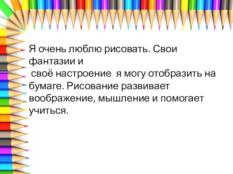 Я очень люблю рисовать. Свои фантазии и своё настроение я могу отобразить на бумаге. Рисование развивает воображение,