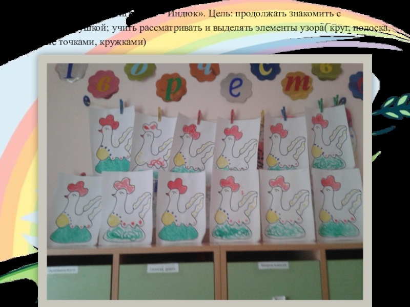 Слайд 8Рисование «Дымковской игрушки – Индюк». Цель: продолжать знакомить с дымковской игрушкой;