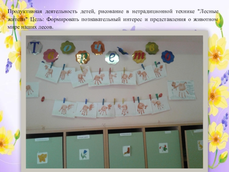 Слайд 9Продуктивная деятельность детей, рисование в нетрадиционной технике "Лесные жители" Цель: Формировать