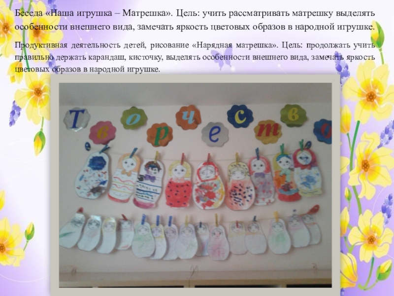 Слайд 7Беседа «Наша игрушка – Матрешка». Цель: учить рассматривать матрешку выделять особенности
