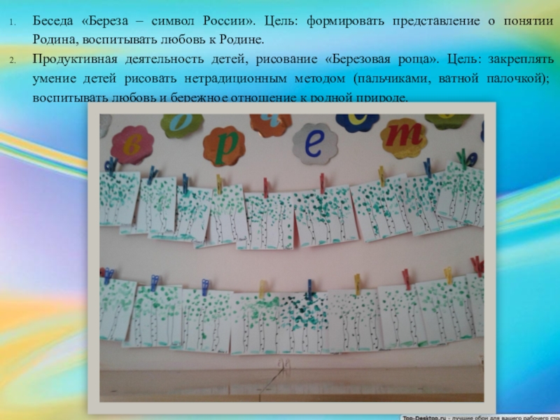 Слайд 6Беседа «Береза – символ России». Цель: формировать представление о понятии Родина,