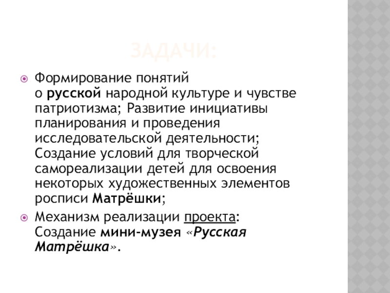 Задачи:Формирование понятий о русской народной культуре и чувстве патриотизма; Развитие инициативы планирования и проведения исследовательской деятельности; Создание условий для