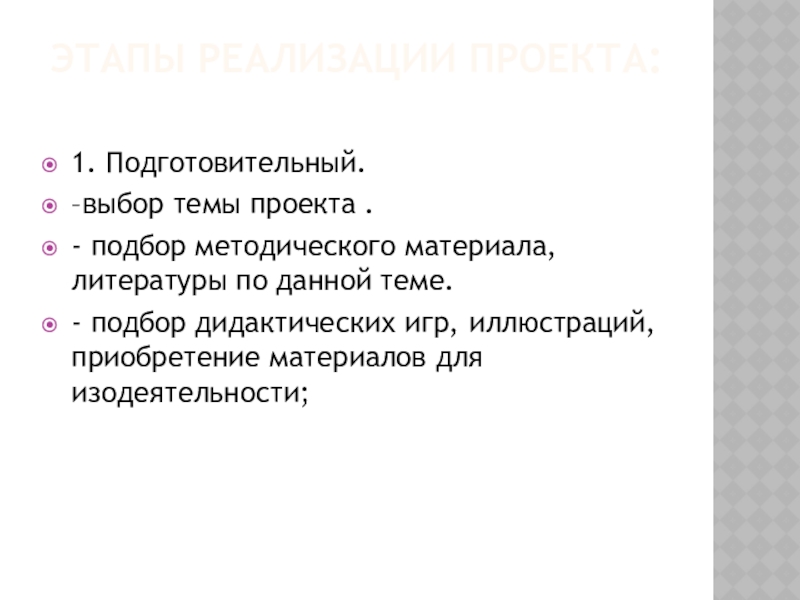 Этапы реализации проекта: 1. Подготовительный.–выбор темы проекта .- подбор методического материала, литературы по данной теме.- подбор дидактических