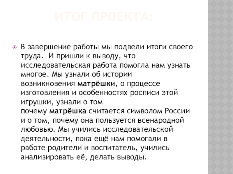к выводу, что исследовательская работа помогла нам узнать многое. Мы узнали об истории возникновения матрёшки, о процессе изготовления и особенностях росписи этой игрушки, узнали о том почему матрёшка считается символом России и о том, почему она пользуется всенародной любовью. Мы учились исследовательской деятельности, пока ещё нам помогали в работе родители и воспитатель, учились анализировать её, делать выводы.