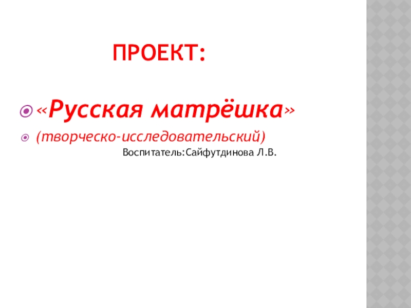 Проект: «Русская матрёшка» (творческо-исследовательский)Воспитатель:Сайфутдинова Л.В.