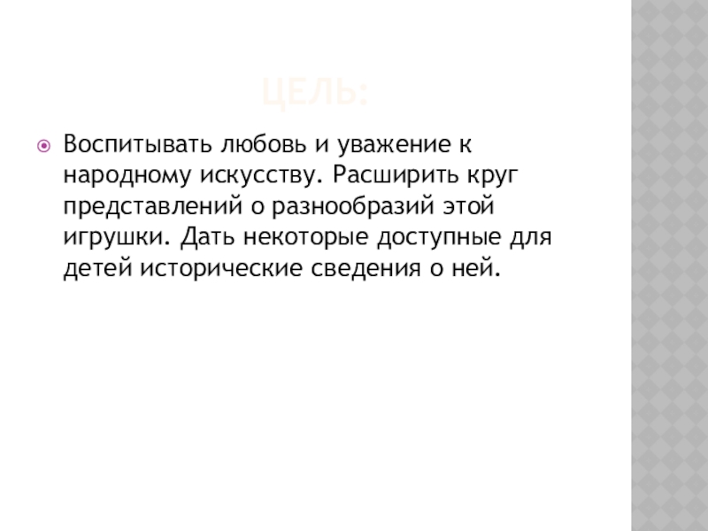Цель:Воспитывать любовь и уважение к народному искусству. Расширить круг представлений о разнообразий этой игрушки. Дать некоторые доступные