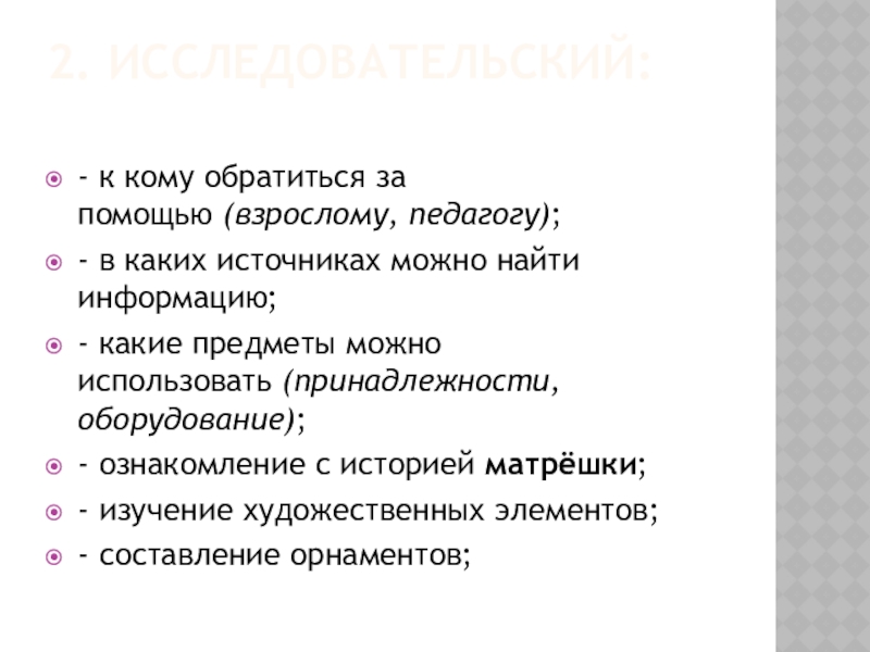 2. Исследовательский: - к кому обратиться за помощью (взрослому, педагогу);- в каких источниках можно найти информацию;- какие предметы