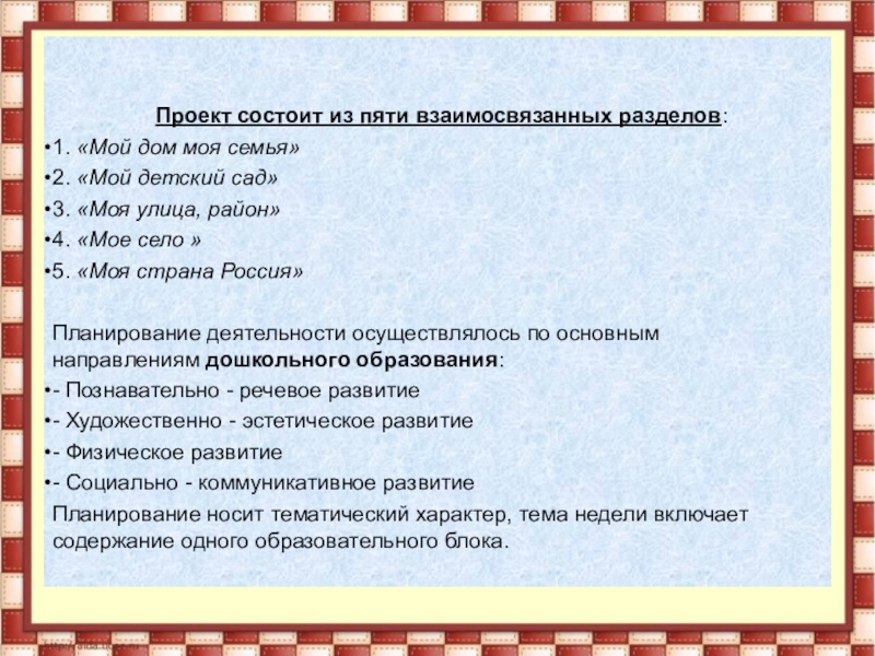 семья», «Мой детский сад», «Моя улица, район», «Мое село », «Моя страна Россия».