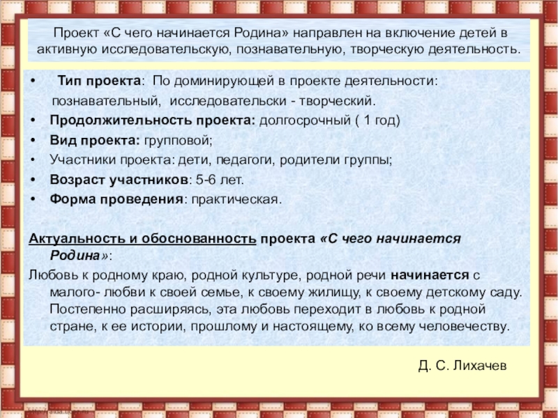 Слайд 2 Проект «С чего начинается Родина» направлен на включение детей в