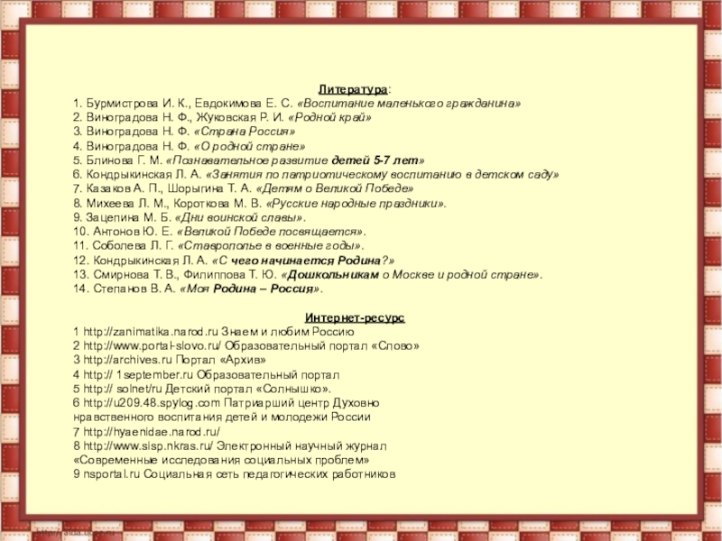1. Бурмистрова И. К., Евдокимова Е. С. «Воспитание маленького гражданина»