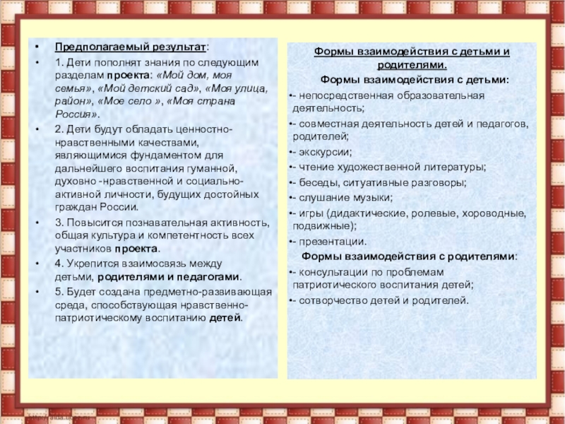 1. Дети пополнят знания по следующим разделам проекта: «Мой дом, моя семья», «Мой