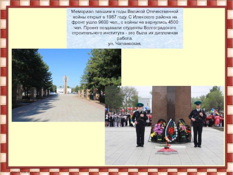 С Илекского района на фронт ушло 9600 чел., с войны не вернулись 4500 чел. Проект создавали студенты Волгоградского строительного института - это была их дипломная работа.