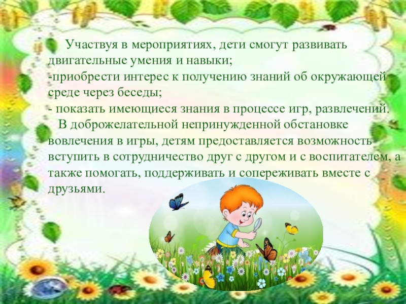 Участвуя в мероприятиях, дети смогут развивать двигательные умения и навыки; -приобрести интерес к получению знаний об окружающей среде через беседы; - показать имеющиеся знания в процессе игр, развлечений.