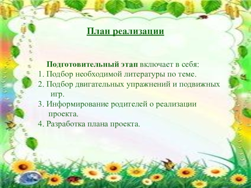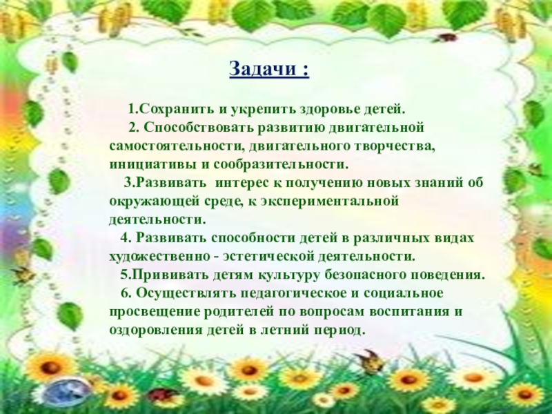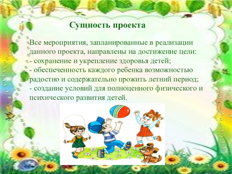 Все мероприятия, запланированные в реализации данного проекта, направлены на достижение цели: - сохранение и укрепление здоровья детей; - обеспеченность каждого ребенка возможностью радостно и содержательно прожить летний период; - создание условий для полноценного физического и психического развития детей.