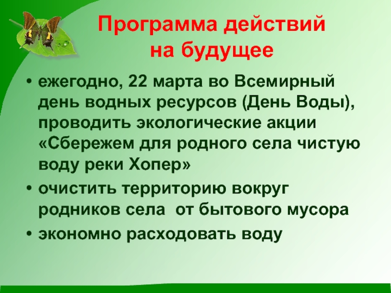Воды), проводить экологические акции «Сбережем для родного села чистую воду реки Хопер»