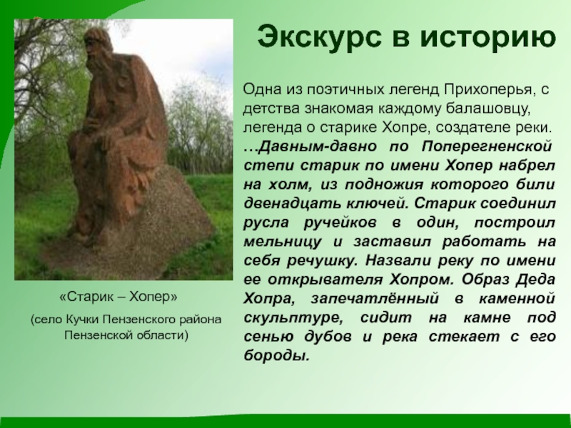 …Давным-давно по Поперегненской степи старик по имени Хопер набрел на холм, из подножия которого били двенадцать ключей. Старик соединил русла ручейков в один, построил мельницу и заставил работать на себя речушку. Назвали реку по имени ее открывателя Хопром. Образ Деда Хопра, запечатлённый в каменной скульптуре, сидит на камне под сенью дубов и река стекает с его бороды.