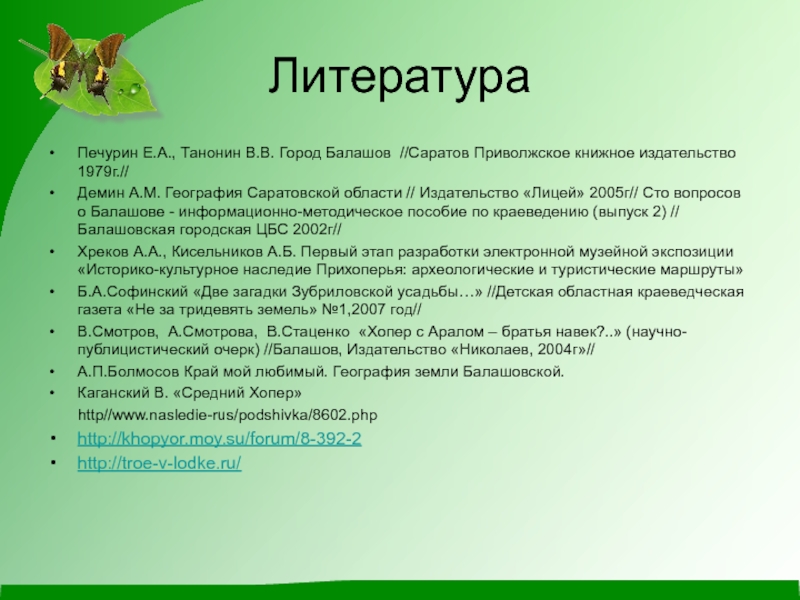 Демин А.М. География Саратовской области // Издательство «Лицей» 2005г// Сто вопросов о Балашове - информационно-методическое пособие по краеведению (выпуск 2) // Балашовская городская ЦБС 2002г//