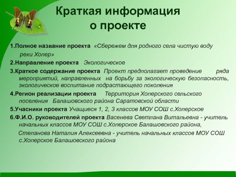 6.Ф.И.О. руководителей проекта Васенева Светлана Витальевна - учитель начальных классов МОУ СОШ с.Хоперское Балашовского района,