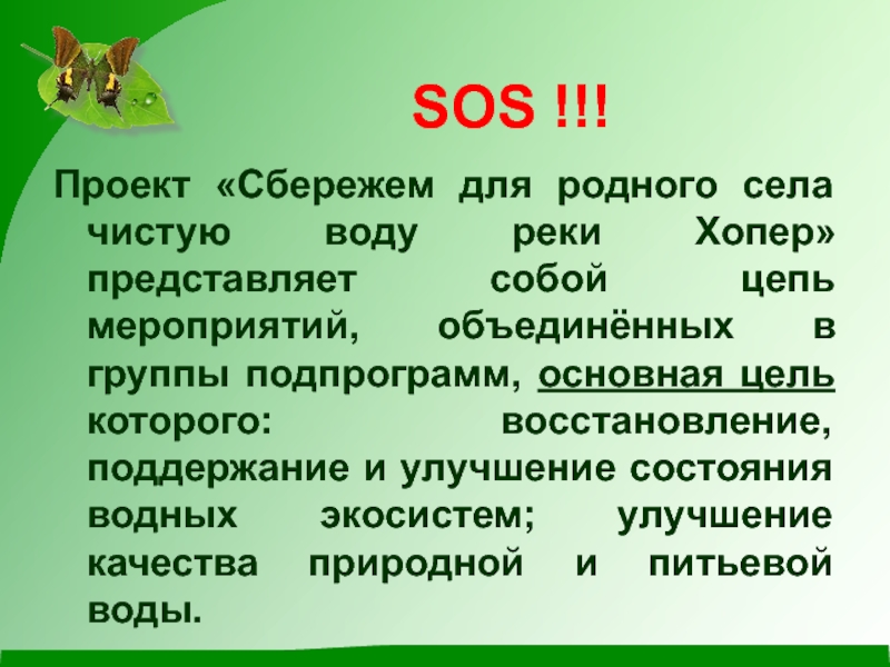 Слайд 15Проект «Сбережем для родного села чистую воду реки Хопер» представляет собой