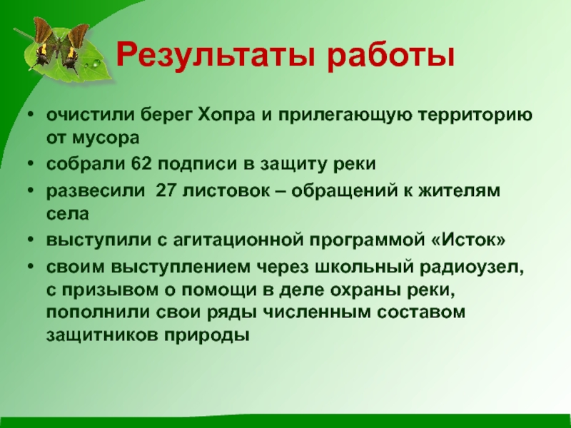 своим выступлением через школьный радиоузел, с призывом о помощи в деле охраны реки, пополнили свои ряды численным составом защитников природы