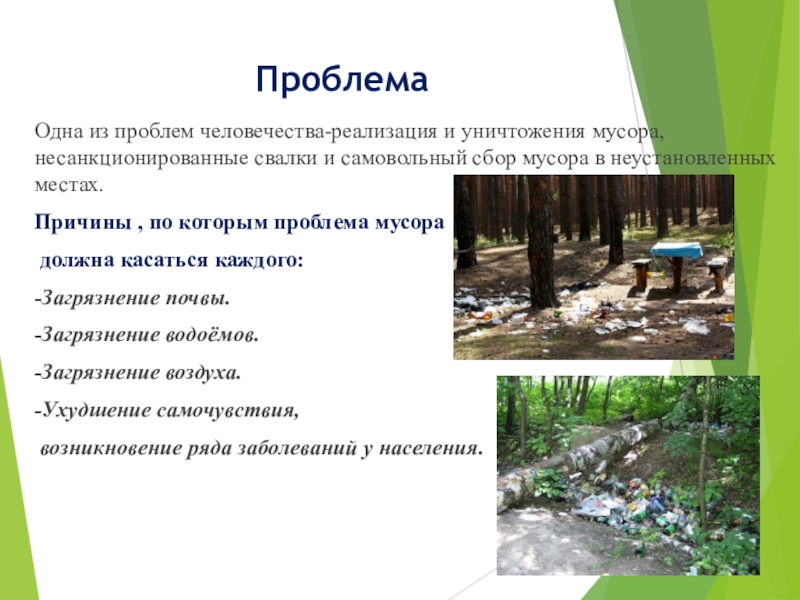 проблем человечества-реализация и уничтожения мусора, несанкционированные свалки и самовольный сбор мусора в неустановленных местах.