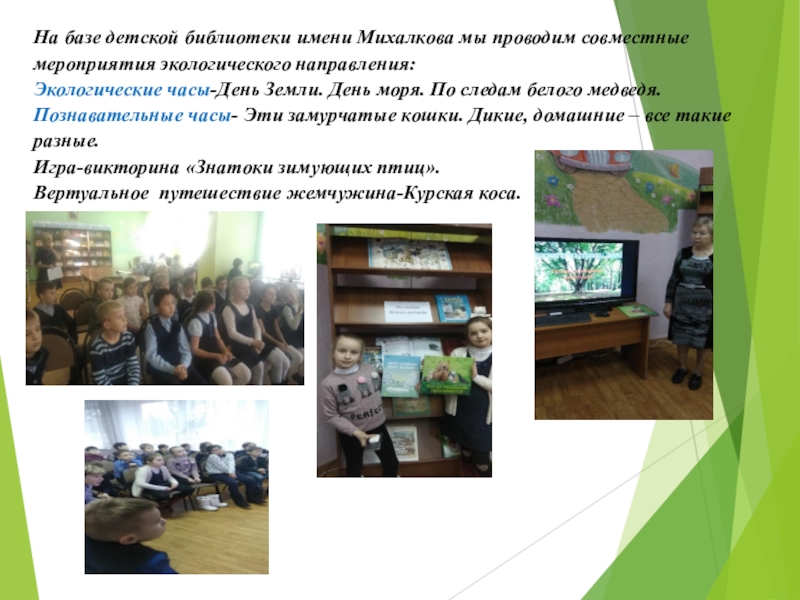 Слайд 18На базе детской библиотеки имени Михалкова мы проводим совместные мероприятия экологического