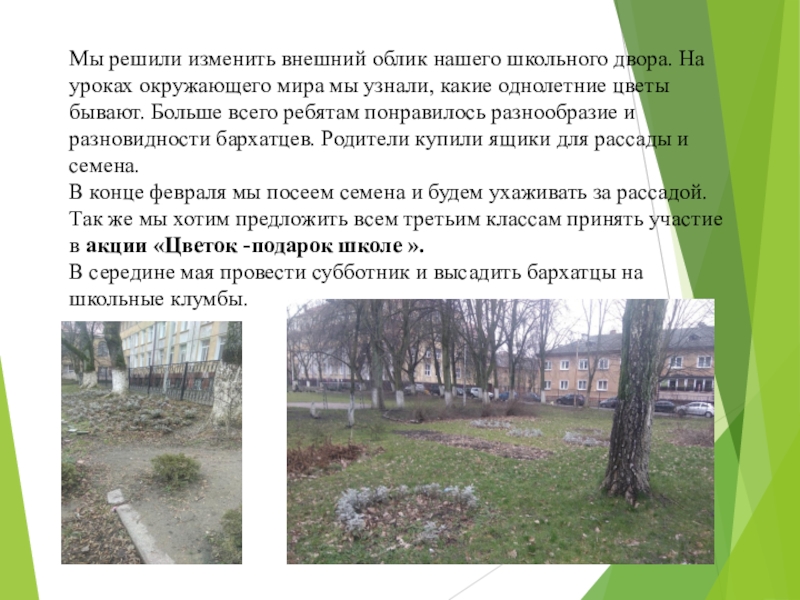 Слайд 20Мы решили изменить внешний облик нашего школьного двора. На уроках окружающего
