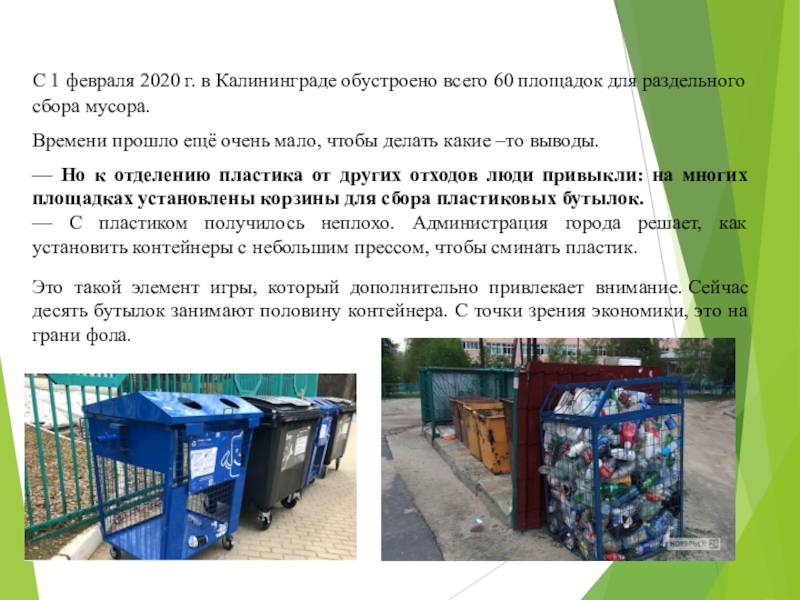 Слайд 14С 1 февраля 2020 г. в Калининграде обустроено всего 60 площадок для раздельного сбора мусора.