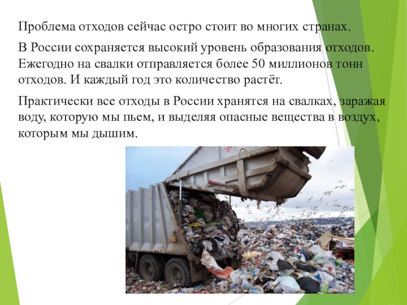 высокий уровень образования отходов. Ежегодно на свалки отправляется более 50 миллионов тонн отходов. И каждый год это количество растёт.