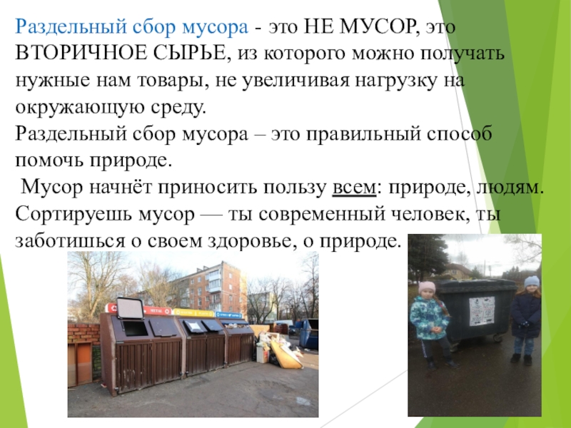 Слайд 13Раздельный сбор мусора - это НЕ МУСОР, это ВТОРИЧНОЕ СЫРЬЕ, из