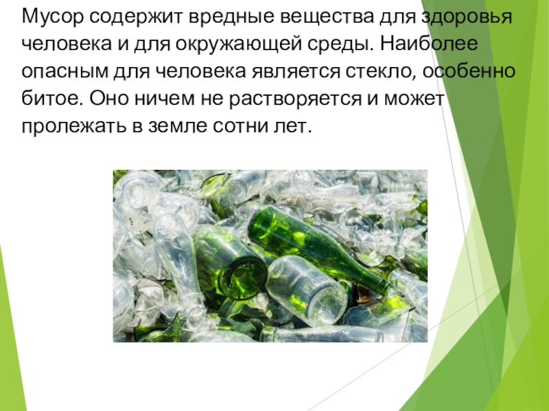 Слайд 7Мусор содержит вредные вещества для здоровья человека и для окружающей среды.
