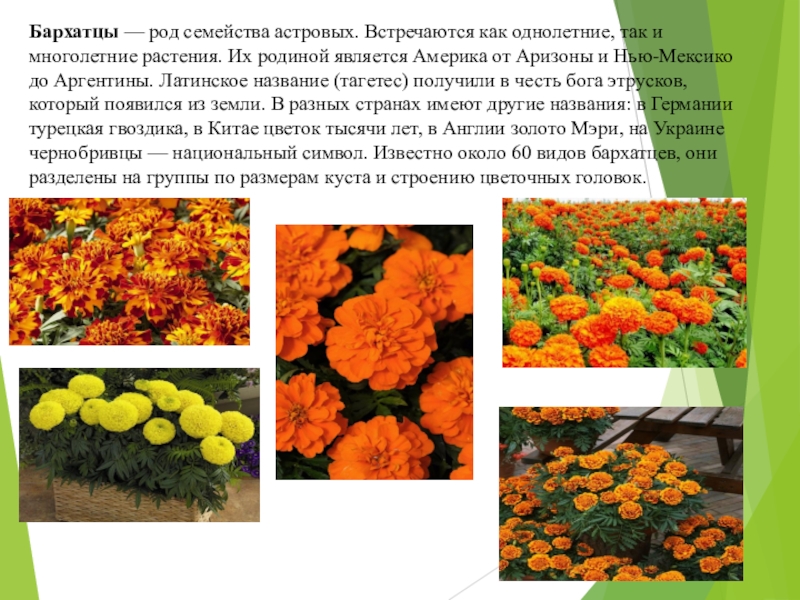 растения. Их родиной является Америка от Аризоны и Нью-Мексико до Аргентины. Латинское название (тагетес) получили в честь бога этрусков, который появился из земли. В разных странах имеют другие названия: в Германии турецкая гвоздика, в Китае цветок тысячи лет, в Англии золото Мэри, на Украине чернобривцы — национальный символ. Известно около 60 видов бархатцев, они разделены на группы по размерам куста и строению цветочных головок.