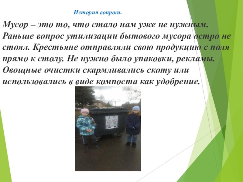 Мусор – это то, что стало нам уже не нужным. Раньше вопрос утилизации бытового мусора остро не стоял. Крестьяне отправляли свою продукцию с поля прямо к столу. Не нужно было упаковки, рекламы. Овощные очистки скармливались скоту или использовались в виде компоста как удобрение.