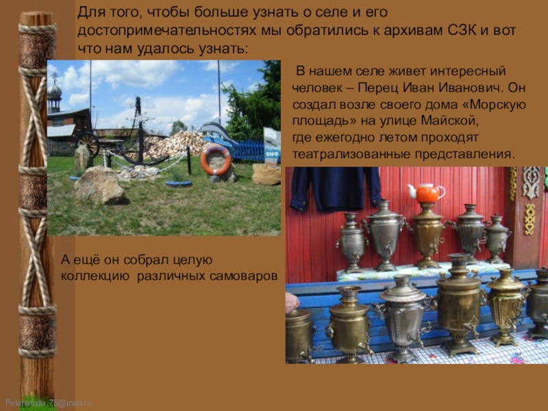 В нашем селе живет интересный человек – Перец Иван Иванович. Он создал возле своего дома «Морскую площадь» на улице Майской,