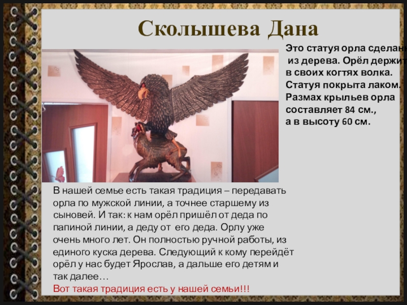 В нашей семье есть такая традиция – передавать орла по мужской линии, а точнее старшему из сыновей. И так: к нам орёл пришёл от деда по папиной линии, а деду от его деда. Орлу уже очень много лет. Он полностью ручной работы, из единого куска дерева. Следующий к кому перейдёт орёл у нас будет Ярослав, а дальше его детям и так далее…