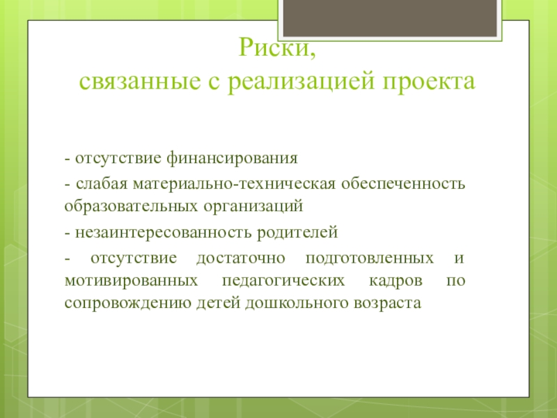 - отсутствие достаточно подготовленных и мотивированных педагогических кадров по сопровождению детей дошкольного возраста
